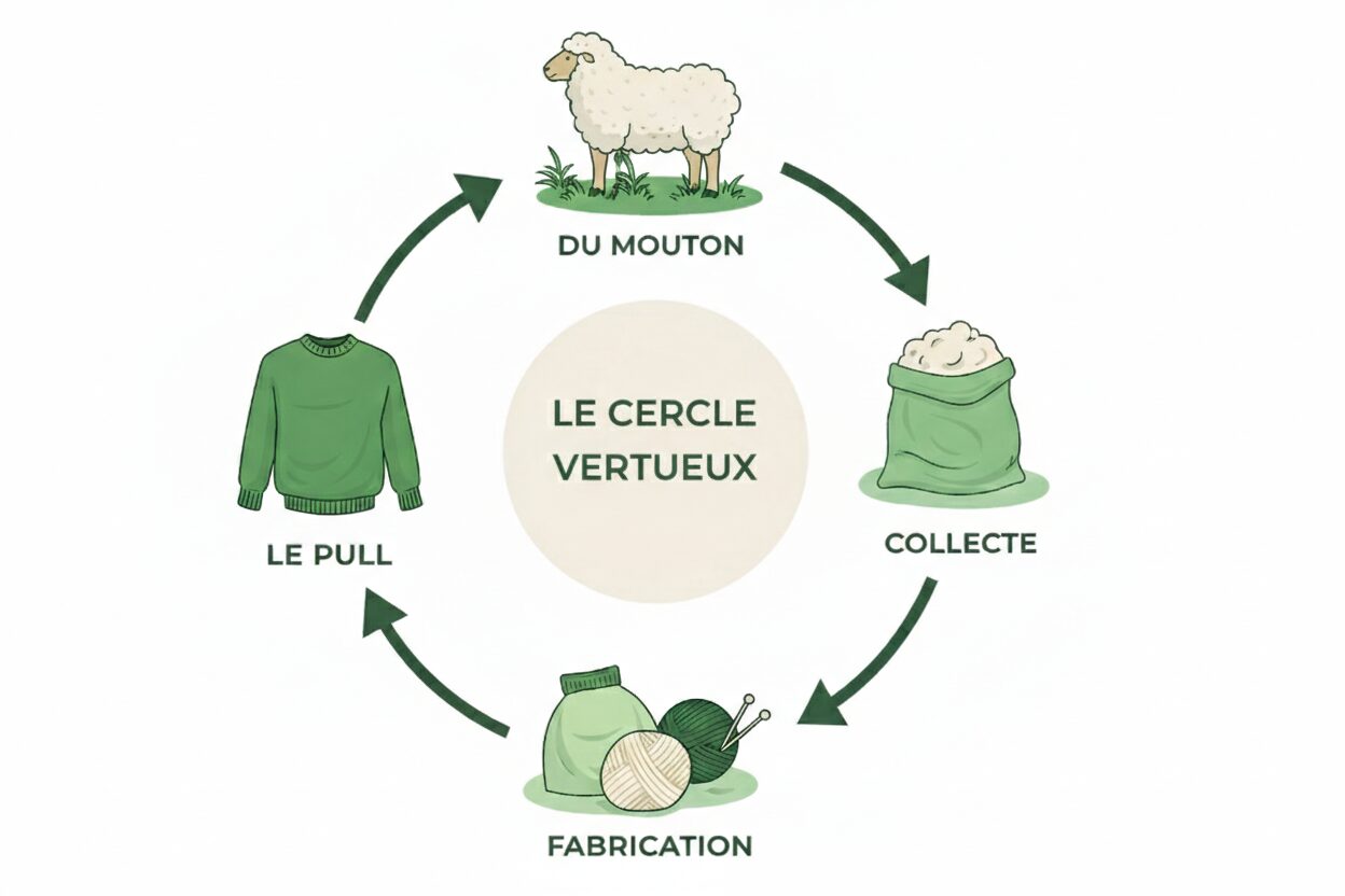 De la matière première à la fabrication du pull, chaque étape est pensée pour limiter le gaspillage, valoriser les ressources existantes et créer des vêtements durables, porteurs de sens et d’impact positif.